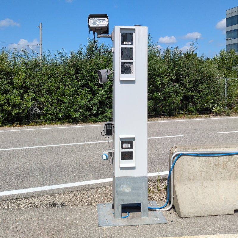 The TRENPEX RoadGate requires only a small distance from the access road (60 cm) and can also be installed between adjacent lanes to seamlessly capture traffic. If necessary, a control cabinet with integrated cameras can also be installed on both sides of the road. If you need a view from above of the open loading area—for example, in the case of dump trucks or skip loaders—to check the fill level of bulk materials (e.g., gravel or scrap metal), there is also the option of installing cameras above the road so that you can monitor passing vehicles from all angles.